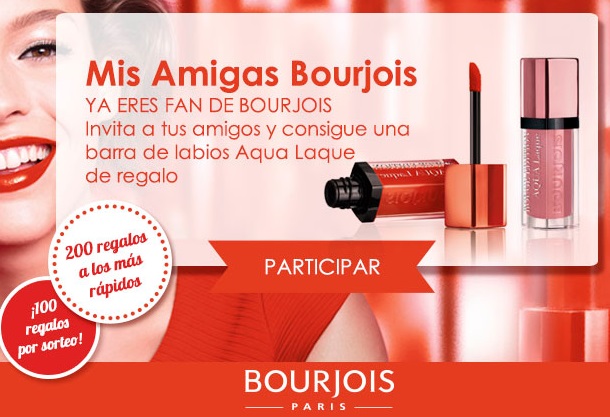 Bourjois regala barras de labios gratis, de la gama Aqua Laque, de forma directa, a las primera 200 personas que participen en esta promoción.